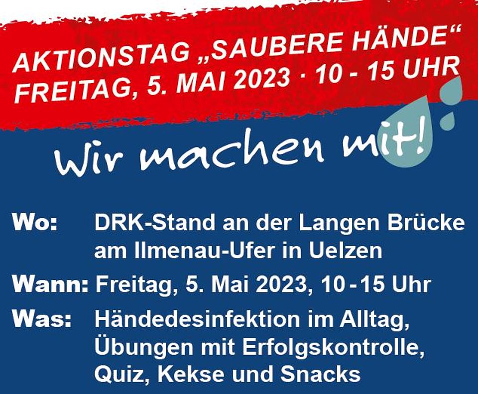 Um auf die Bedeutung von Händedesinfektion auch in Nach-Corona-Zeiten aufmerksam zu machen, nimmt das DRK Uelzen an der „Aktion Saubere Hände“ teil. An einem Informationsstand an der Langen Brücke bei den Ilmenauwiesen in Uelzen erfahren Interessierte am Freitag, den 5. Mai von 10 bis 15 Uhr alles Wissenswerte über das Thema Handhygiene im Alltag und Gesundheitswesen.
