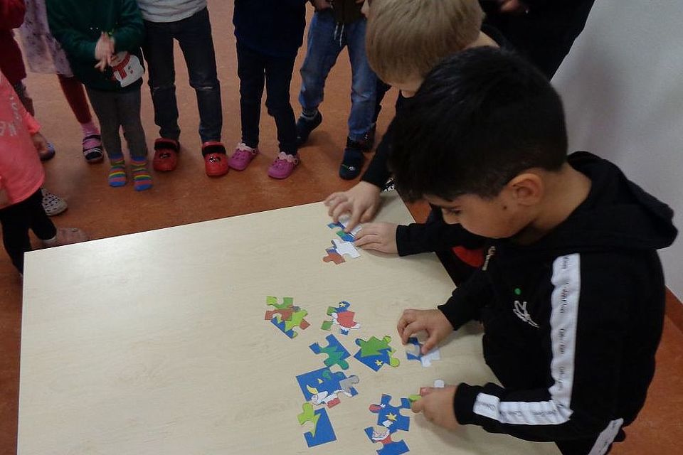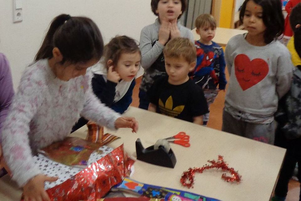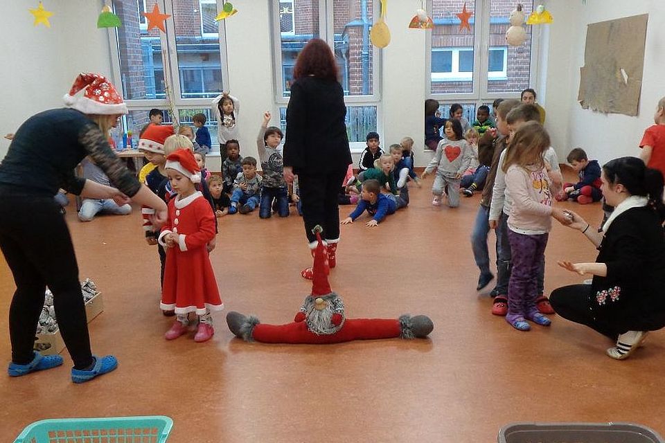 Am Nikolaustag verbrachten beide Kindergarten-Gruppen den Tag gemeinsam in der großen Bewegungshalle. Am Vormittag fand eine Weihnachtsrallye mit sechs verschiedenen Stationen statt. Die Wettspiele zwischen grüner und oranger Gruppe begannen mit einer lustigen Schlittenfahrt auf Teppichfliesen. Weiter ging es mit zwei identischen Weihnachtspuzzles, wer ist zuerst fertig? Dann wurden Weihnachtspäckchen gepackt und mit Schleifen versehen und auch hier die Frage: Welche Gruppe ist am schnellsten? Beim Winter-Marathon mussten die Kinder sich erst mit Mütze, Schal und Handschuhen bekleiden und schon konnte der Lauf starten. Sehr lustig ging es beim Weihnachtslieder gurgeln zu. Tatsächlich erkannten die Kinder die gegurgelten Weihnachtslieder. Zum Schluss folgte eine Schneeballschlacht bei der Schneebälle aus Zeitungspapier in einen Korb geworfen werden musste. Nach einem schönen gemeinsamen Mittagessen und noch Zeit zum Spielen kamen dann am Nachmittag die Eltern dazu und lauschten den Weihnachtsliedern und einem Nikolaus-Gedicht ihrer Kinder. Ein lautes Klopfen am Fenster ließ alle Anwesenden zusammenfahren – hatte doch der Nikolaus tatsächlich einen Sack mit Kleinigkeiten vor das Fenster gelegt. (Kita Gartenstraße)