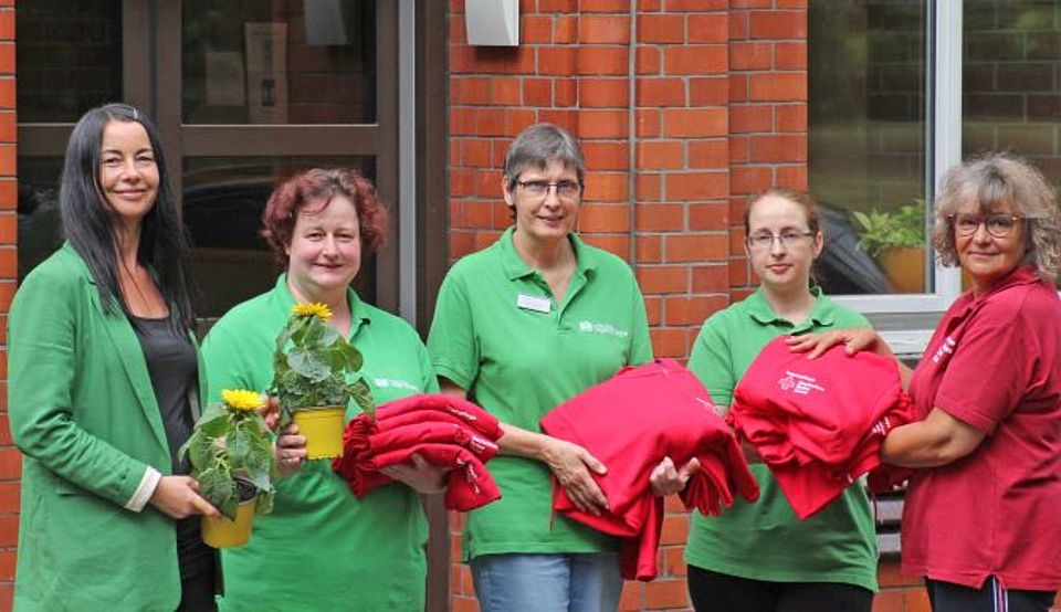 Nicole Cordes, Bereichsleiterin (links) und Ellen Culemann, Pflegedienstleiterin der Tagespflege Uelzen, begrüßen das Bevenser Team und überreichen die neue Dienstkleidung.
