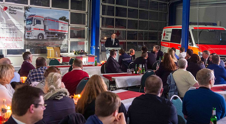 Neben einem ganz besonderen Dank für die Arbeit der DRK-Bereitschaft Kreis Uelzen hatte der Chef des DRK-Kreisverbands, Tim Meierhoff, ein langersehntes Geschenk im Gepäck. Er überreichte einen nagelneuen VW-Mannschaftstransportwagen (MTW). Dieser hat sieben Sitze und jede Menge Stauraum für Gepäck, Bierzeltgarnituren oder was sonst noch so transportiert werden muss. Mit Blaulicht und Martinshorn wurde das Fahrzeug unter dem Applaus der Bereitschaftsmitglieder in die Halle gefahren. Bereitschaftssplitter:Helferstundenmeister wurde Marc Garmatz. Insgesamt standen 1102 Helferstunden auf seinem Konto. Ernennungen: