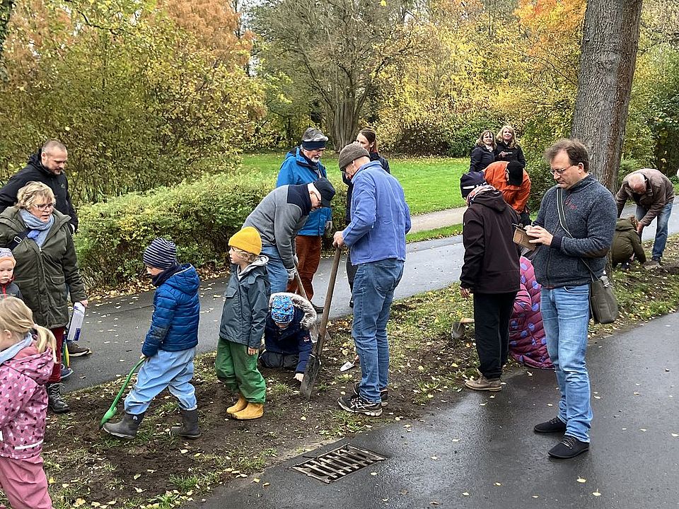 Das Frühjahr kann kommen - wir freuen uns auf ein Blütenmeer. Knapp 1000 Blumenzwiebeln haben Ehrenamtliche, Freiwillige und Kinder aus der DRK-Kita Ilmenauufer unter Anleitung der Firma Hoppe Garten- und Landschaftsbau GmbH & Co. KG gesetzt. Entlang des Radwegs an den Ilmenauwiesen wurden Tulpen, Narzissen, Blausternchen um Krokusse in die Erde gesetzt, die im kommenden Frühjahr den Streifen in ein Blütenmeer tauchen wird.
