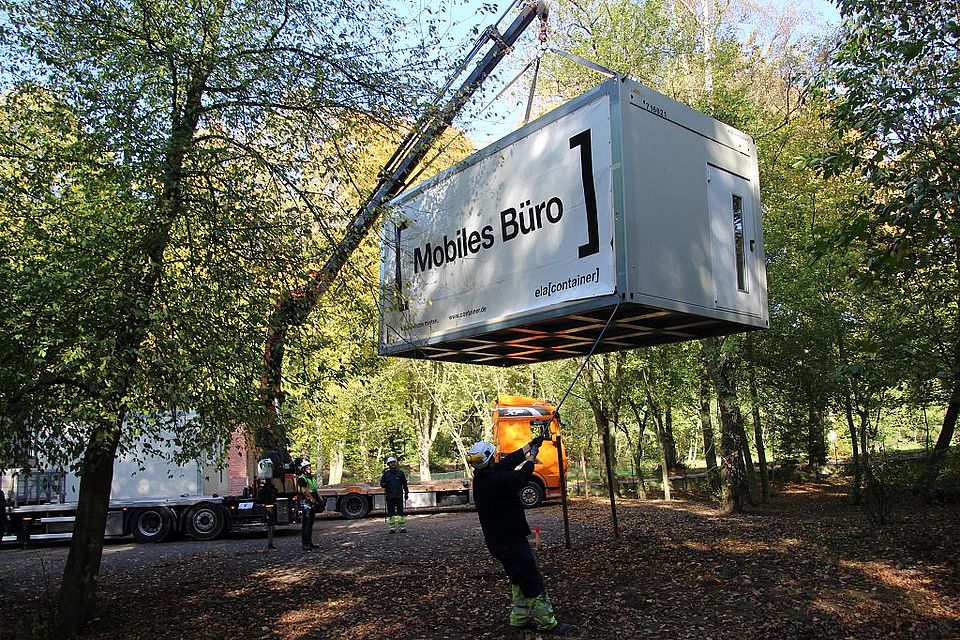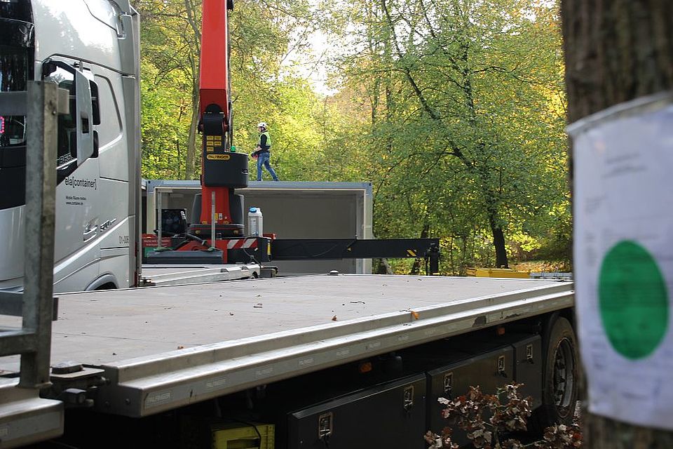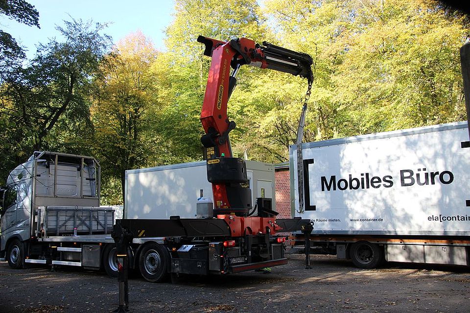 Mit vier Haken an jeder Ecke wird der Container befestigt und mit Hilfe eines kleinen Krans vom Lkw gehoben. Die ersten sechs von insgesamt 25 Containern stehen seit Montagmittag gut einsehbar von der Ebstorfer Straße aus auf dem Gelände der Villa am Park.
