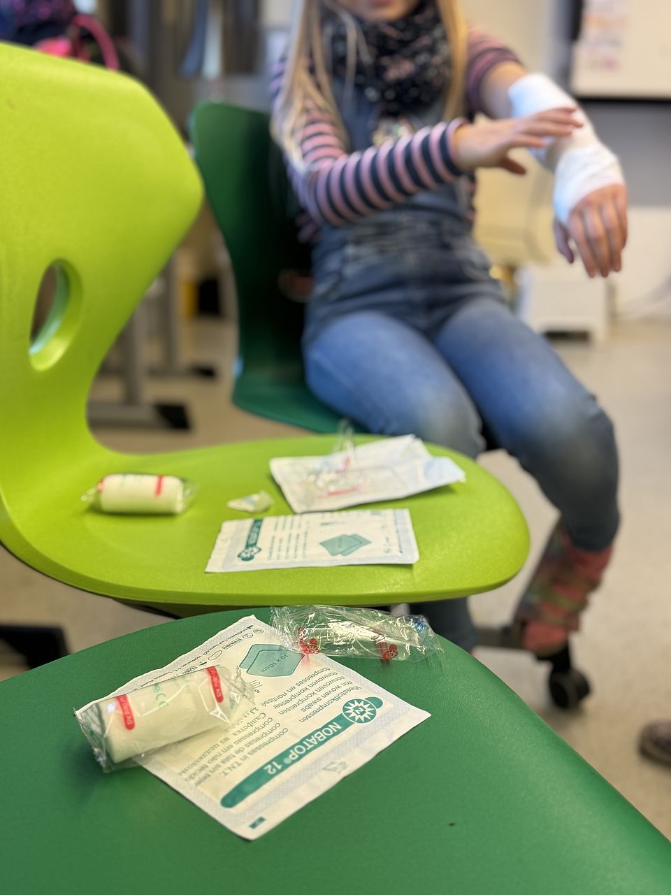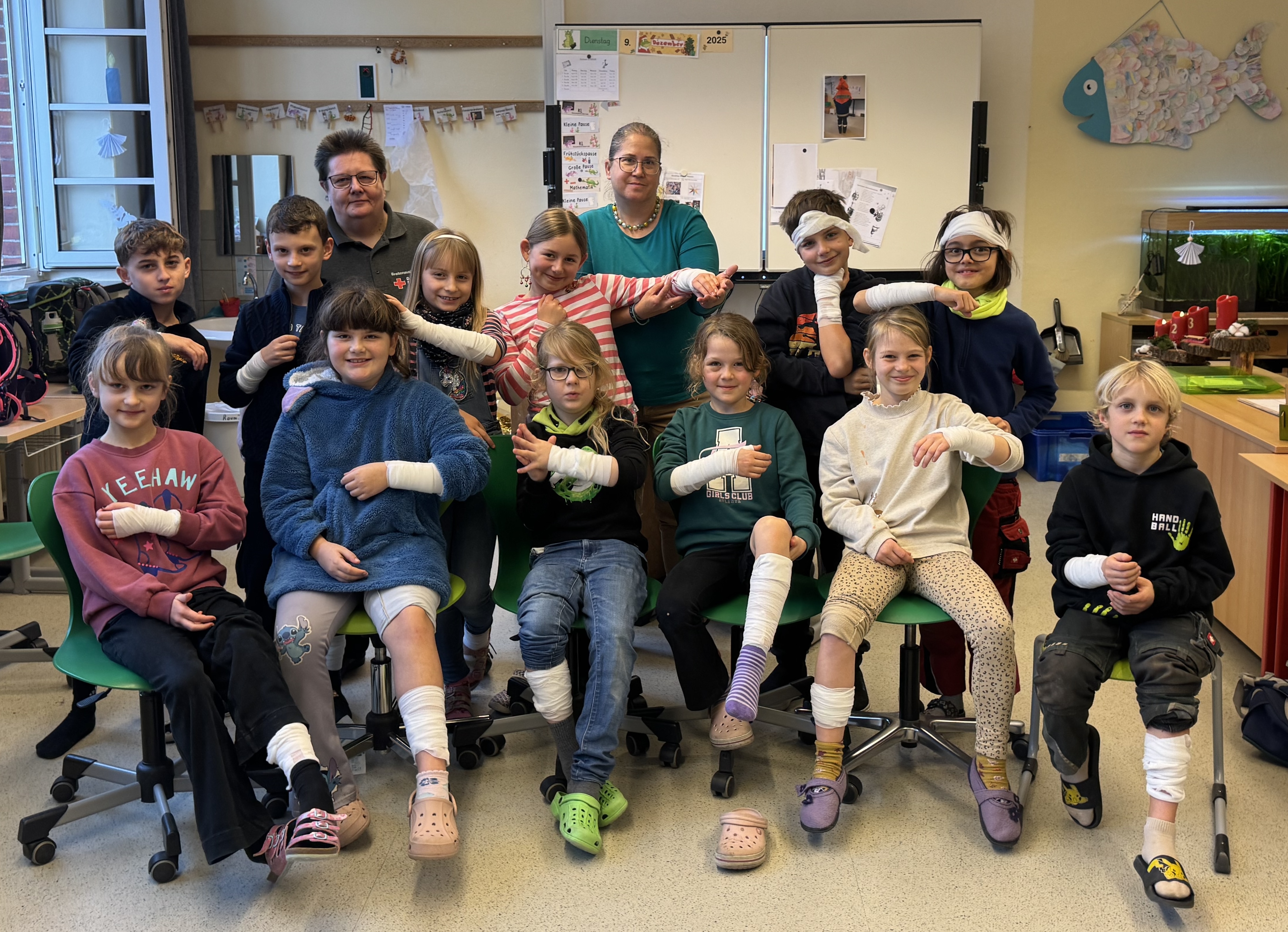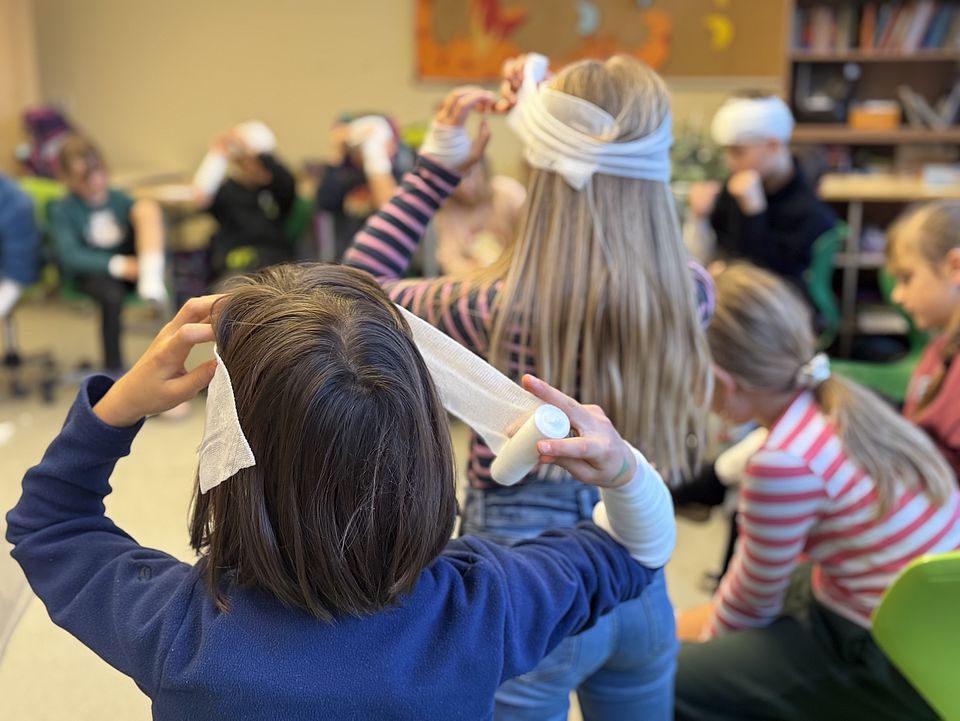 Umtriebig geht es in der Klasse 3b der Grundschule Wrestedt zu. Während Gustav noch Jonas’ Arm verbindet, hat Ella sich bereits einen Kopfverband angelegt. Petra Meyer vom DRK Uelzen erklärt anschließend im großen Stuhlkreis, welche Verbände in welchen Notfällen zum Einsatz kommen. „Wir führen die Kinder spielerisch an die Erste-Hilfe heran und nehmen ihnen die Angst, im Ernstfall etwas falsch zu machen“, erklärt sie.