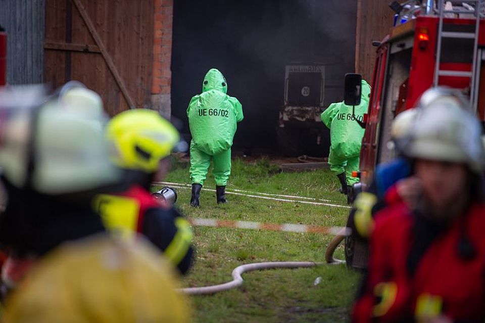 Im Verlauf des Szenarios fand ein Trupp in der Scheune mehrere Behälter mit Gefahrgut, welche sich, durch die entsprechende Recherche der eingesetzten Einsatzleitwagen die mit in der Übung eingebunden waren, als Salzsäure heraus stellten. Weitere Maßnahmen mussten somit getroffen werden. Feuerwehr Leute wurden mit Chemikalienschutzanzügen ausgerüstet, ein Dekontaminationsplatz wurde hergerichtet. Eine Drohe der Feuerwehr startete mit ihrem Flug, um ein Lagebild aus der Luft einzufangen.