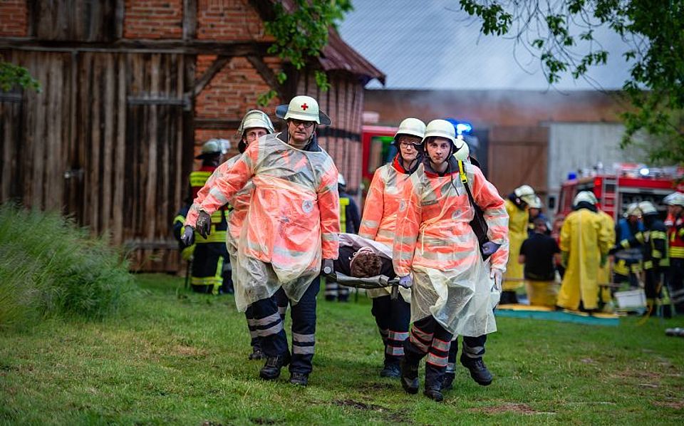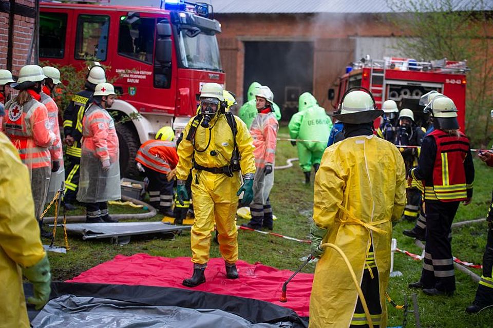 Knapp 100 Einsatzkräfte von der DRK-Bereitschaft Kreis Uelzen sowie der Feuerwehr aus Gloste in Natendorf, dem 2. Fachzug Nord und dem Gefahrgutzug Nord probten am 9. Mai 2019 auf dem Gelände den Ernstfall. Angenommen wurde ein Schwelbrand in einer der Scheunen.