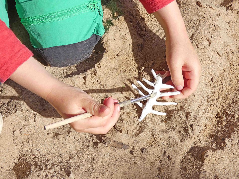 Und dann heißt es: „Nichts wie los“. Mit einer persönlichen Stempelkarte marschieren die Kinder von Station zu Station. Unter anderem erfühlen sie an einem Barfußpfad die unterschiedlichen Begebenheiten von Bodenmaterialien und suchen auf einer Entdeckertour vielfältige Farben für das Naturbingo. An der Ausgrabungsstelle für Dinosaurierknochen beginnen die Kinder mit Pinseln ausgerüstet ihre Arbeit. Wie bei echten paläontologischen Ausgrabungen müssen sie vorsichtig arbeiten, damit die Knochen nicht zerstört werden.