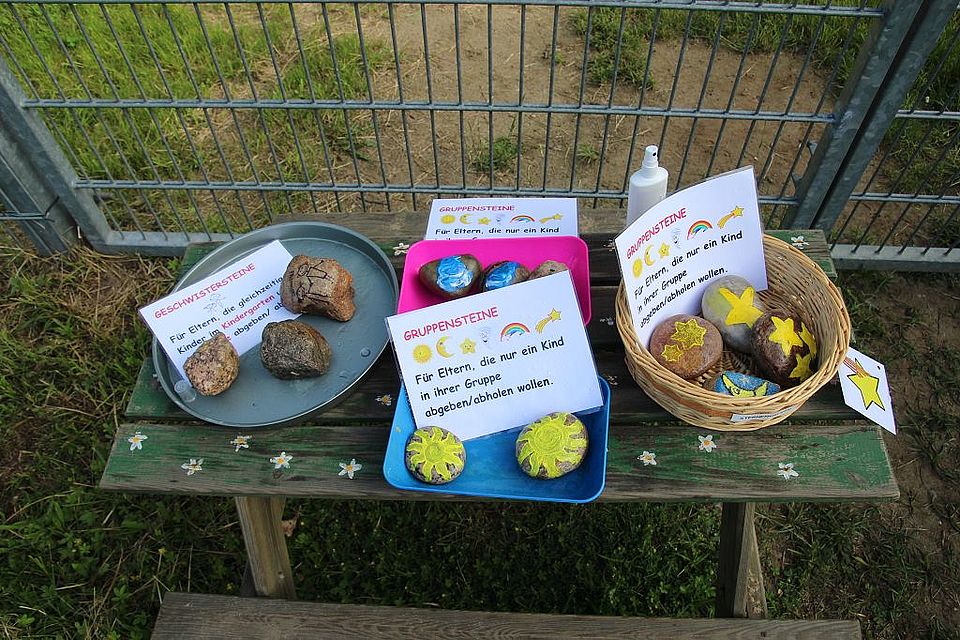 Seitens des Landes Niedersachsen ist ein eingeschränkter Regelbetrieb genehmigt worden. Allerdings unter Einhaltung strikter Auflagen: verschiedene Eingänge, getrennte Spielbereiche für die einzelnen Gruppen – der Infektionsschutz steht an oberster Stelle. An den jeweiligen Eingängen stehen kleine Körbe mit bemalten Steinen, wer sein Kind bringt, nimmt sich einen Stein mit dem entsprechenden Symbol und geht zur entsprechenden Gruppe. Ist kein Stein da, muss kurz am Eingang gewartet werden, Steine, die zurückgelegt werden, werden selbstverständlich desinfiziert. Das Hygienekonzept wird genau eingehalten.