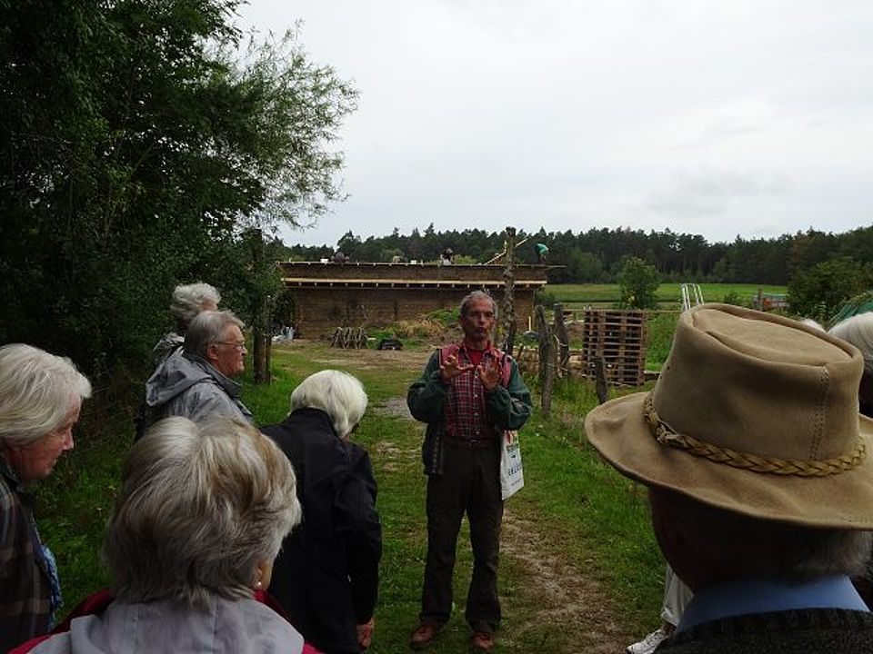 Ebstorf. Nach einigen Jahren der Zwangspause konnten die Senioren-Gymnastikgruppen des DRK-Ortsvereins Ebstorf und Freunde wieder einen Ausflug unternehmen. Als Ziel hatte Übungsleiterin Brigitte Müller-Andrae ein Ökodorf in der Altmark gewählt. Das Ökodorf wurde erst im Jahr 1997 von Menschen gegründet, die neue, umweltgerechtere und sozialere Lebensformen gesucht haben. Damals standen 20 Hektar Land und ein zerfallendes Restbauernhaus einer ehemaligen LPG zum Kauf. Mittlerweile konnte Land hinzugekauft werden, so dass sich das Dorf jetzt über 110 Hektar inklusive Gärten sowie zusätzlichen 60 Hektar Wald erstreckt. Es leben rund 150 Menschen, davon zweidrittel Erwachsene, in den entstandenen Gebäuden und Bauwagen. Alle Häuser sind strohgedämmt und nur mit Materialien, teilweise auch gebrauchten, aus der Umgebung errichtet. Es gibt einen Naturkostladen, ein Haus der Stille, einen Waldkindergarten, ein Amphitheater sowie einen Schwimmteich. Die riesigen Gärten liefern Obst und Gemüse zur Eigenversorgung. Die Ebstorfer Besucher konnten direkt beim Bau des neuen Gemüselagers mit 90 Zentimeter dicken Strohwänden zuschauen. „Nächste Woche ist das fertig!“, war Gästeführer Stefan überzeugt. Gelebt wurde zu Beginn in großen Gemeinschaften, die sich mittlerweile aber meist aufgrund gemachter Erfahrungen verkleinert und in Familienverbände unterteilt haben. Ein veganes Drei-Gängemenü aus Kürbissuppe, Reis mit Hirsebratling, Mangold und Tomaten sowie Apfel zum Nachtisch war eine weitere interessante Erfahrung, hat aber geschmeckt und satt gemacht. Apfelkuchen und Brownie mit Schlagsahne zum Kaffee kamen ebenfalls gut an. Der geführte Rundgang war sehr informativ und konnte kaum alle Nachfragen abklären. Ein gelungener Ausflug mit einem Einblick in eine ganz andere Lebensform.