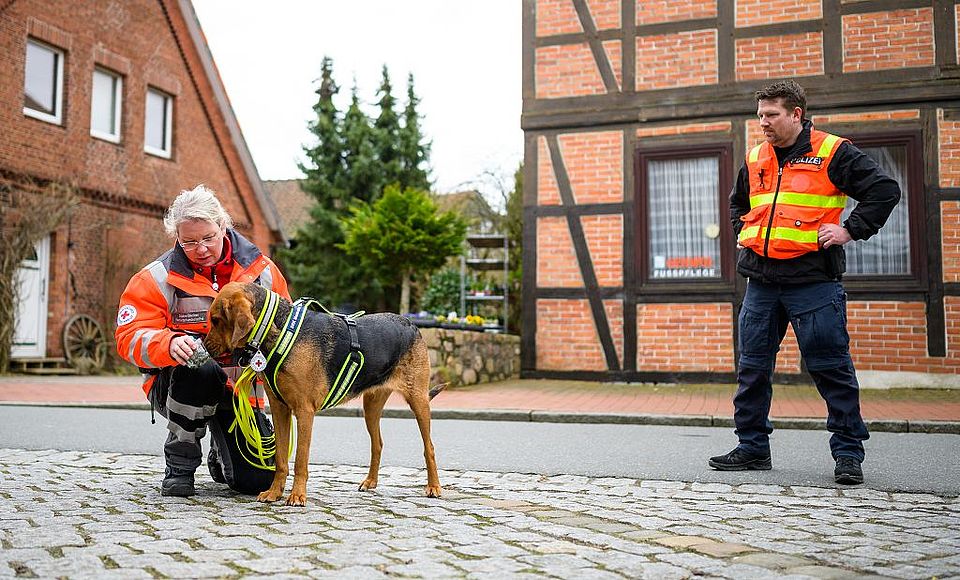 Neben Hündin Erka ist auch Sabine Becker eine lange und umfassende Ausbildung durchlaufen: Sanitätshelfer, Kynologie am Hund (Wissenschaft des Hundes), Erste Hilfe am Hund, Orientierung und Funkausbildung, rechtliches Wissen, Einsatztaktik und vieles mehr werden von den Hundeführern gefordert. „Es ist ein extrem weites Feld“, sagt Becker, die sich 2018 der DRK-Bereitschaft Kreis Uelzen angeschlossen hat.