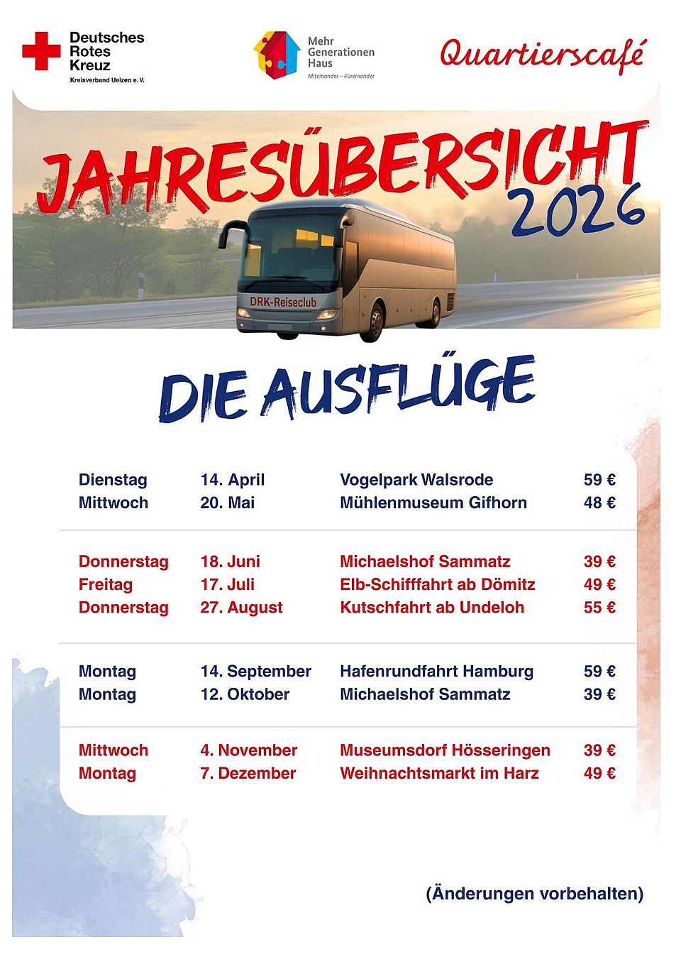 Freuen Sie sich auf sorgfältig geplante Programme, attraktive Reiseziele und faire Preise von unter 100 Euro pro Fahrt.